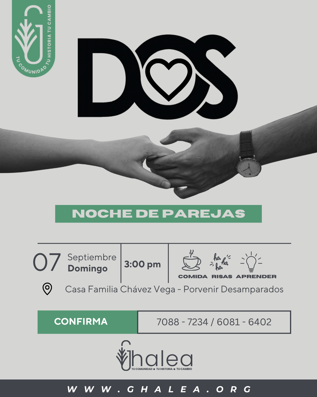 Ya sean casados, comprometidos o novios, jóvenes o adultos, todas las parejas son bienvenidas a formar parte de DOS. Un espacio para crecer juntos en el amor, fortalecer sus relaciones y profundizar en la fe, caminando de la mano hacia un propósito mayor.